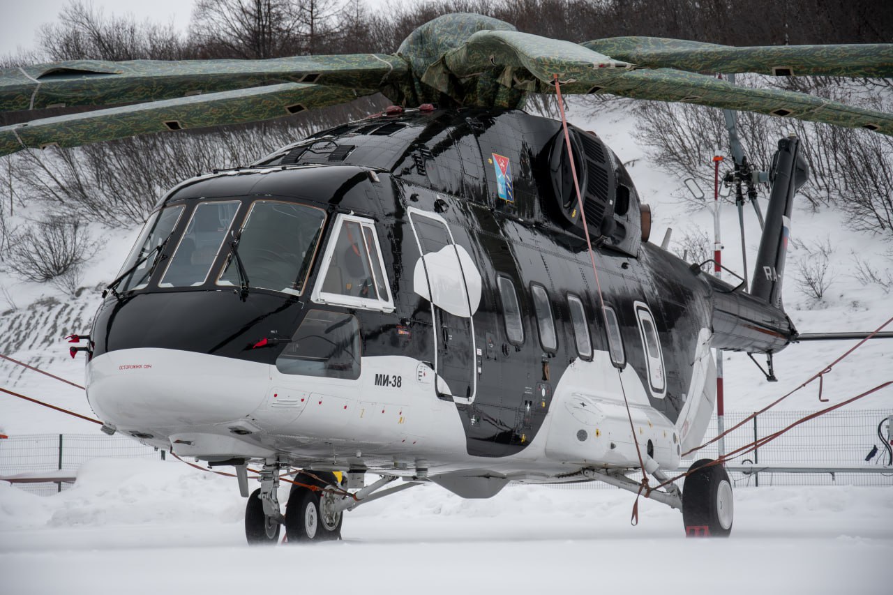Вертолеты Ми-38-4 авиакомпании ОГУП «Авиация Колымы» с регистрационными номерами RA-14340 (заводской номер 26004, серийный номер 01-04) и RA-14343 (заводской номер 26006, серийный номер 01-06) во время промежуточной посадки в аэропорту Новосибирска при перелёте к месту их постоянного базирования в Магадан, 05.03.2024 (с) NskPlanes / vk.com